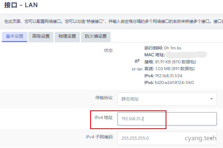- 修改 R2S 的 LAN 口 IP 地址和主路由在一个网段,例如 192.168.31.2 后保存并应用