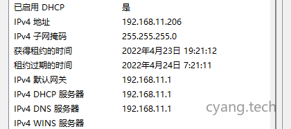 - 查看笔记本有线网卡 IP 信息,我使用的固件网关地址为 192.168.11.1